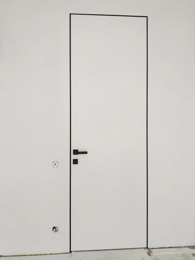 Двери под покраску стоят на скрытом алюминиевом коробе: его монтируют на этапе черновых работ и закрывают отделочными материалами — гипсокартоном, штукатуркой или панелями. Петли тоже скрытые: их не видно, когда закрыта дверь.